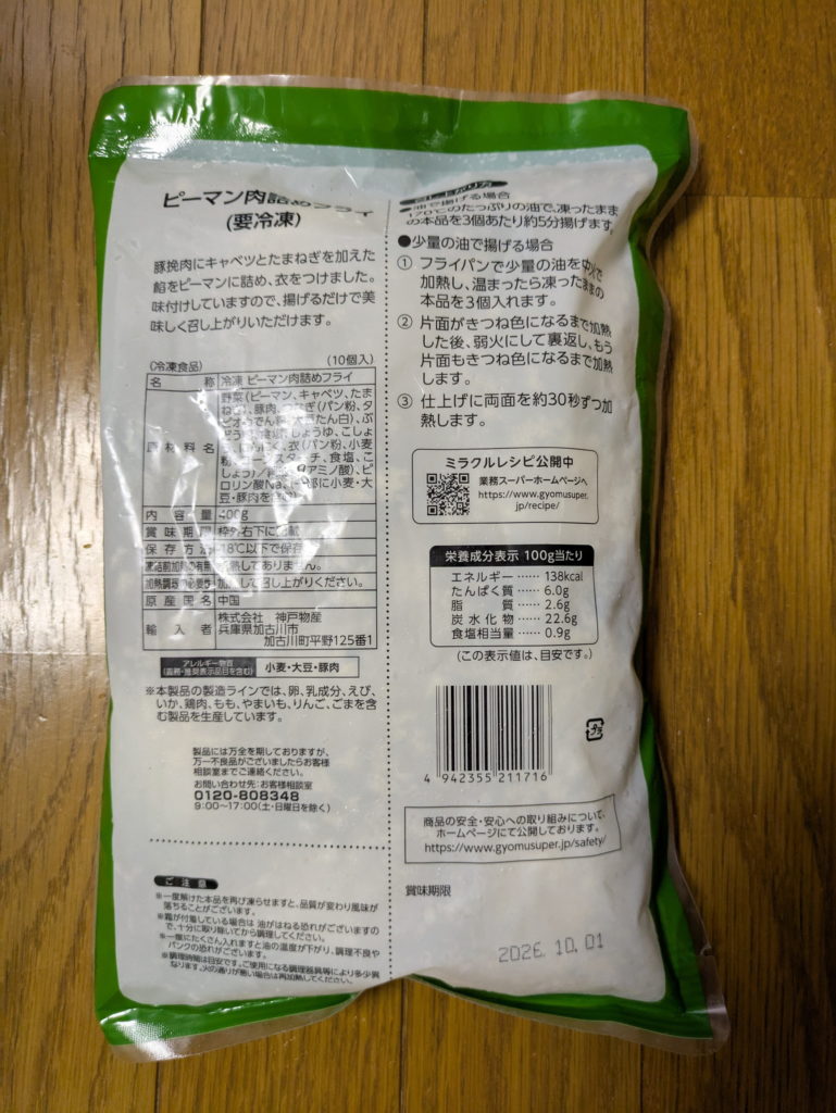 神戸物産 ピーマン肉詰めフライ 400g(10個入) 358円 業務スーパーで購入 購入日:2025/08/13